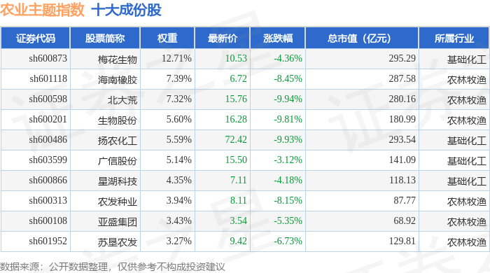农业主题(000122)指数十大成份股详情如下: