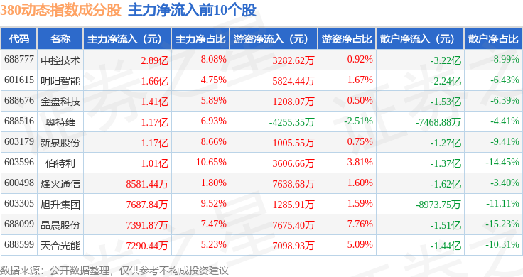 资金流向方面,380动态(000141)指数成份股当日主力资金净流出合计76.65亿元,游资资金净流入合计47.92亿元,散户资金净流入合计28.73亿元。成份股资金流向详情见下表: