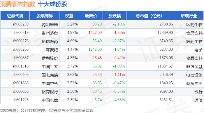 消费领先(000148)指数十大成份股详情如下:
