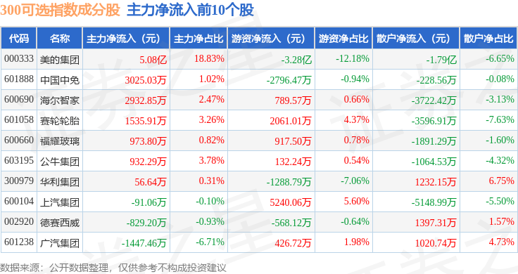 资金流向方面,300可选(000911)指数成份股当日主力资金净流出合计15.3亿元,游资资金净流入合计7.0亿元,散户资金净流入合计8.3亿元。成份股资金流向详情见下表: