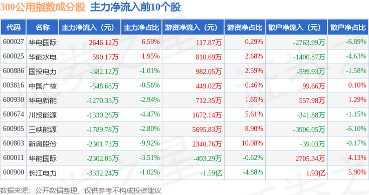 资金流向方面,300公用(000917)指数成份股当日主力资金净流出合计2.61亿元,游资资金净流入合计9615.49万元,散户资金净流入合计1.65亿元。成份股资金流向详情见下表:
