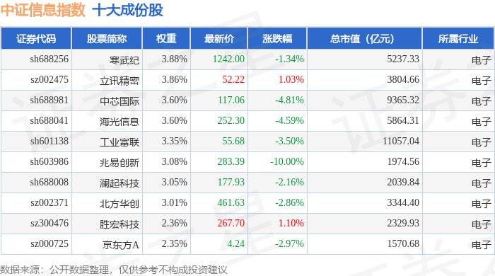 证券之星消息,2月2日,中证信息(000935)指数报收于6686.42点,跌3.63%,成交2952.73亿元,换手率2.64%。当日该指数成份股中,上涨的有11家,鹏鼎控股以3.01%的涨幅领涨,下跌的有121家,华虹公司以12.64%的跌幅领跌。