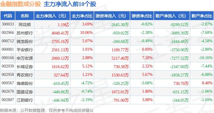 资金流向方面,金融指数(399240)成份股当日主力资金净流出合计13.35亿元,游资资金净流入合计6.91亿元,散户资金净流入合计6.44亿元。成份股资金流向详情见下表: