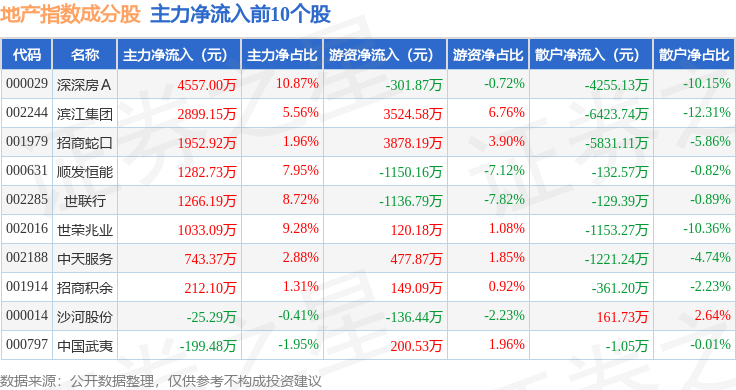 资金流向方面,地产指数(399241)成份股当日主力资金净流出合计4.06亿元,游资资金净流入合计8997.87万元,散户资金净流入合计3.16亿元。成份股资金流向详情见下表: