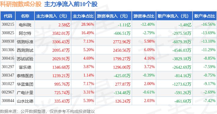 资金流向方面,科研指数(399243)成份股当日主力资金净流入合计3938.23万元,游资资金净流入合计3739.56万元,散户资金净流出合计7677.78万元。成份股资金流向详情见下表: