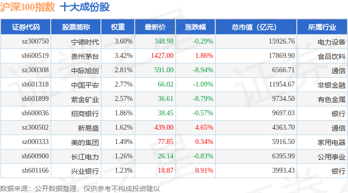 沪深300(399300)指数十大成份股详情如下: