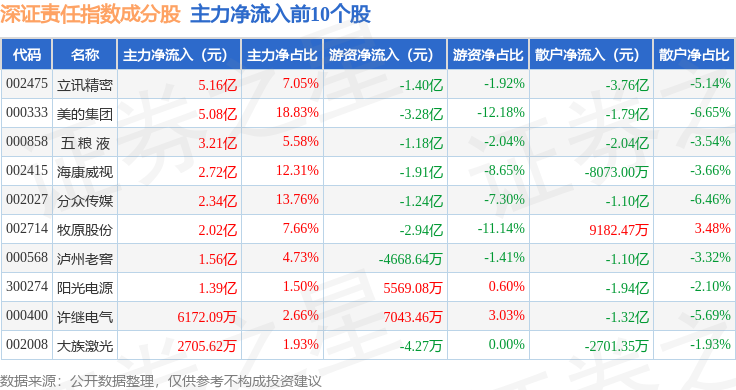 资金流向方面,深证责任(399341)指数成份股当日主力资金净流出合计51.85亿元,游资资金净流入合计8.36亿元,散户资金净流入合计43.49亿元。成份股资金流向详情见下表: