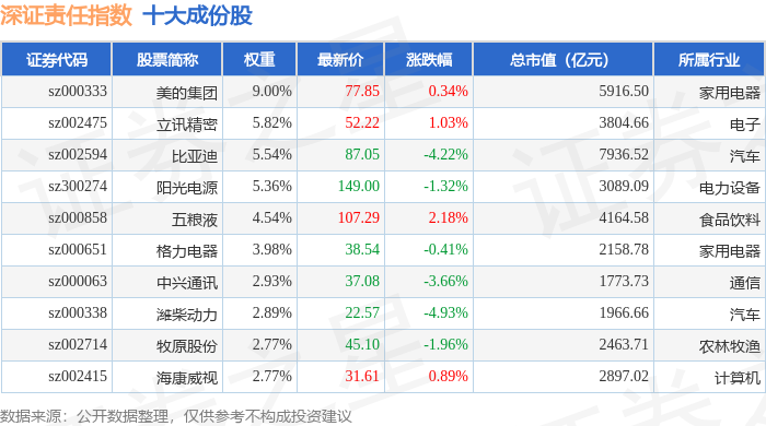 深证责任(399341)指数十大成份股详情如下: