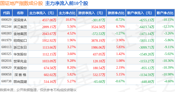 资金流向方面,国证地产(399393)指数成份股当日主力资金净流出合计9.52亿元,游资资金净流入合计4.18亿元,散户资金净流入合计5.35亿元。成份股资金流向详情见下表: