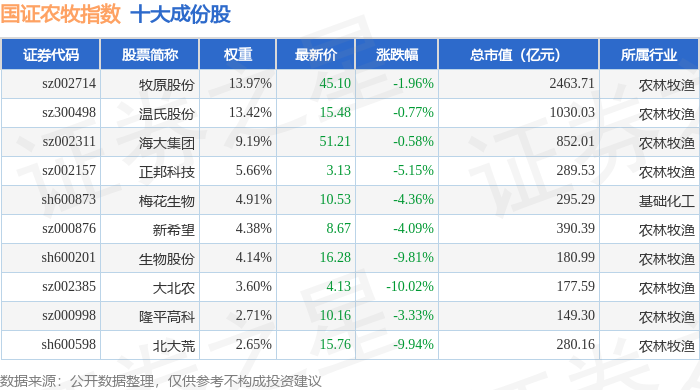 证券之星消息,2月2日,国证农牧(399435)指数报收于3906.5点,跌3.9%,成交243.58亿元,换手率4.47%。当日该指数成份股中,下跌的有40家,荃银高科以15.93%的跌幅领跌。
