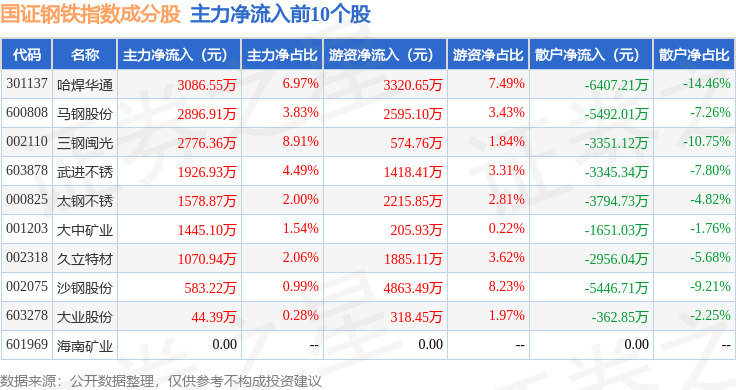 资金流向方面,国证钢铁(399440)指数成份股当日主力资金净流出合计14.45亿元,游资资金净流入合计7.54亿元,散户资金净流入合计6.91亿元。成份股资金流向详情见下表: