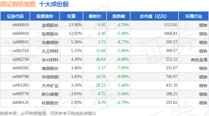 国证钢铁(399440)指数十大成份股详情如下: