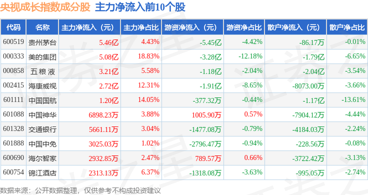 资金流向方面,央视成长(399552)指数成份股当日主力资金净流出合计12.56亿元,游资资金净流入合计1.63亿元,散户资金净流入合计10.94亿元。成份股资金流向详情见下表: