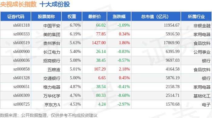 央视成长(399552)指数十大成份股详情如下: