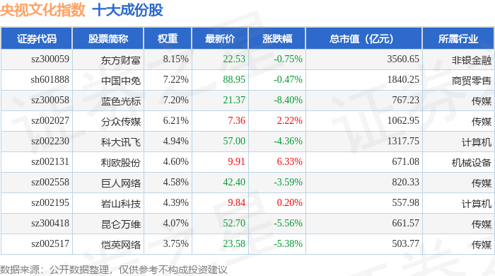 资金流向方面,央视文化(399557)指数成份股当日主力资金净流出合计41.4亿元,游资资金净流入合计13.4亿元,散户资金净流入合计28.0亿元。成份股资金流向详情见下表: