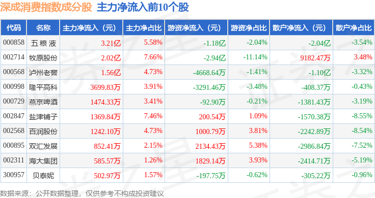 资金流向方面,深成消费(399684)指数成份股当日主力资金净流入合计2.64亿元,游资资金净流出合计1.85亿元,散户资金净流出合计7874.73万元。成份股资金流向详情见下表: