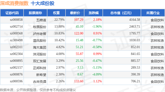 深成消费(399684)指数十大成份股详情如下: