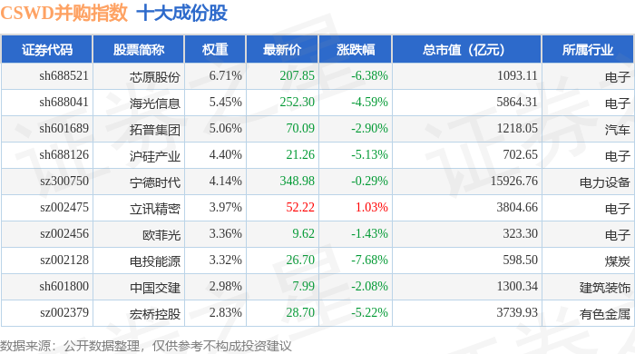 CSWD并购(399992)指数十大成份股详情如下: