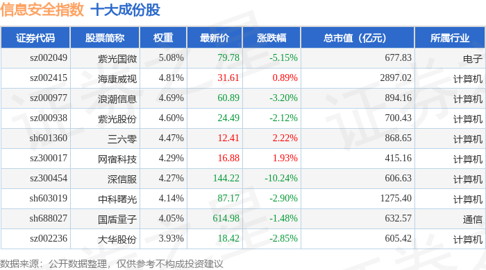 证券之星消息,2月2日,信息安全(399994)指数报收于1910.83点,跌2.53%,成交554.59亿元,换手率3.96%。当日该指数成份股中,上涨的有8家,神思电子以4.16%的涨幅领涨,下跌的有54家,深信服以10.24%的跌幅领跌。