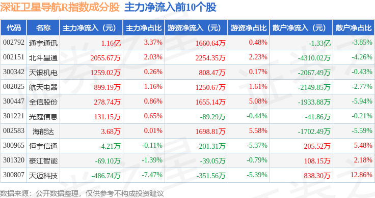 资金流向方面,深证卫星导航R(470050)指数成份股当日主力资金净流出合计22.41亿元,游资资金净流入合计8.94亿元,散户资金净流入合计13.47亿元。成份股资金流向详情见下表: