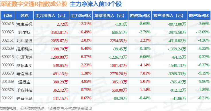 资金流向方面,深证数字交通R(470049)指数成份股当日主力资金净流出合计6.32亿元,游资资金净流入合计1.19亿元,散户资金净流入合计5.13亿元。成份股资金流向详情见下表: