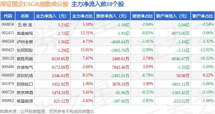 资金流向方面,深证国企ESGR(470055)指数成份股当日主力资金净流出合计25.87亿元,游资资金净流入合计7.58亿元,散户资金净流入合计18.28亿元。成份股资金流向详情见下表: