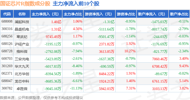 资金流向方面,国证芯片R(480017)指数成份股当日主力资金净流出合计74.6亿元,游资资金净流入合计24.04亿元,散户资金净流入合计50.56亿元。成份股资金流向详情见下表: