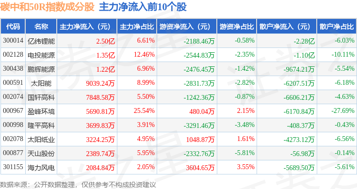 资金流向方面,碳中和50R(480021)指数成份股当日主力资金净流出合计30.76亿元,游资资金净流入合计7.33亿元,散户资金净流入合计23.43亿元。成份股资金流向详情见下表: