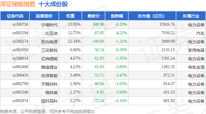 深证储能(970036)指数十大成份股详情如下: