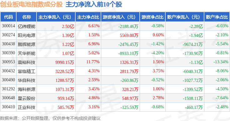 资金流向方面,创业板电池(970081)指数成份股当日主力资金净流出合计7.07亿元,游资资金净流入合计3.04亿元,散户资金净流入合计4.03亿元。成份股资金流向详情见下表: