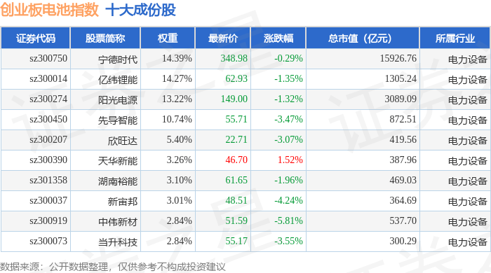 创业板电池(970081)指数十大成份股详情如下: