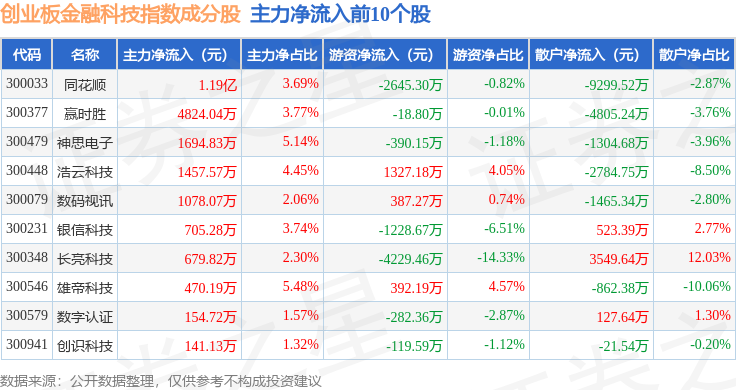 资金流向方面,创业板金融科技(970085)指数成份股当日主力资金净流出合计9.52亿元,游资资金净流入合计2.39亿元,散户资金净流入合计7.14亿元。成份股资金流向详情见下表: