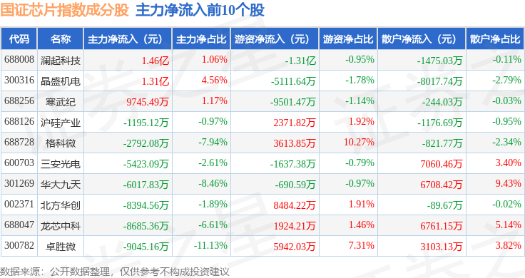资金流向方面,国证芯片(980017)指数成份股当日主力资金净流出合计74.6亿元,游资资金净流入合计24.04亿元,散户资金净流入合计50.56亿元。成份股资金流向详情见下表: