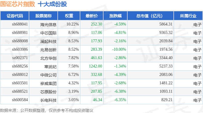 证券之星消息,2月2日,国证芯片(980017)指数报收于14031.15点,跌4.9%,成交1024.84亿元,换手率2.98%。当日该指数成份股中,上涨的有1家,晶盛机电以5.41%的涨幅领涨,下跌的有29家,北京君正以11.06%的跌幅领跌。