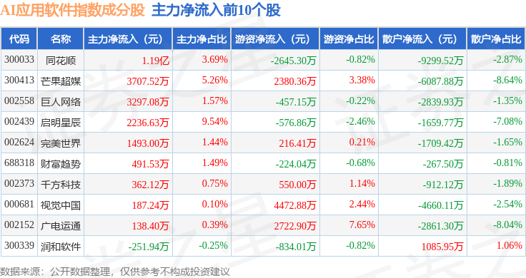 资金流向方面,AI应用软件(980107)指数成份股当日主力资金净流出合计60.28亿元,游资资金净流入合计17.17亿元,散户资金净流入合计43.11亿元。成份股资金流向详情见下表: