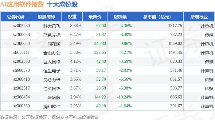 AI应用软件(980107)指数十大成份股详情如下: