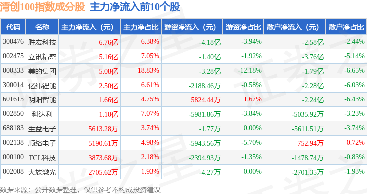 资金流向方面,湾创100(980001)指数成份股当日主力资金净流出合计88.02亿元,游资资金净流入合计25.64亿元,散户资金净流入合计62.39亿元。成份股资金流向详情见下表: