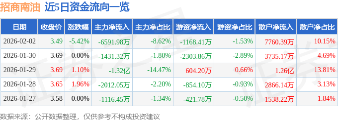 证券之星消息,截至2026年2月2日收盘,招商南油(601975)报收于3.49元,下跌5.42%,换手率4.62%,成交量216.18万手,成交额7.65亿元。