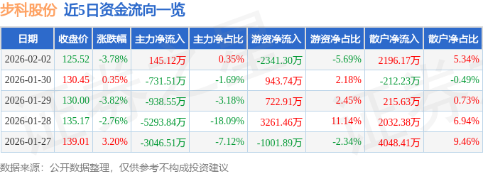 证券之星消息,截至2026年2月2日收盘,步科股份(688160)报收于125.52元,下跌3.78%,换手率3.5%,成交量3.18万手,成交额4.11亿元。