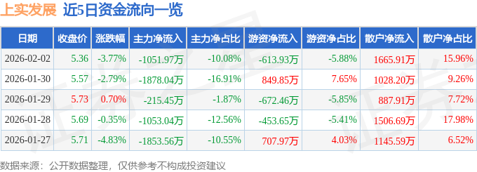 证券之星消息,截至2026年2月2日收盘,上实发展(600748)报收于5.36元,下跌3.77%,换手率1.04%,成交量19.11万手,成交额1.04亿元。