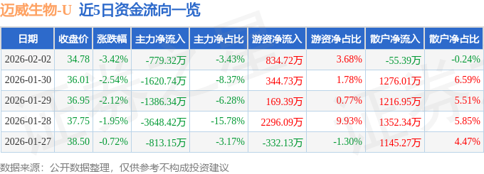 证券之星消息,截至2026年2月2日收盘,迈威生物(688062)报收于34.78元,下跌3.42%,换手率3.14%,成交量6.41万手,成交额2.27亿元。