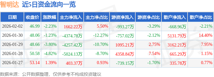 证券之星消息,截至2026年2月2日收盘,智明达(688636)报收于46.99元,下跌2.23%,换手率3.77%,成交量6.32万手,成交额3.02亿元。