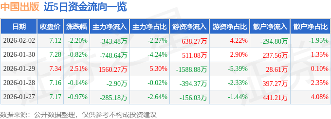 证券之星消息,截至2026年2月2日收盘,中国出版(601949)报收于7.12元,下跌2.2%,换手率1.1%,成交量20.91万手,成交额1.51亿元。