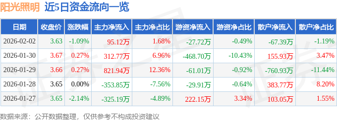 证券之星消息,截至2026年2月2日收盘,阳光照明(600261)报收于3.63元,下跌1.09%,换手率1.16%,成交量15.45万手,成交额5677.4万元。