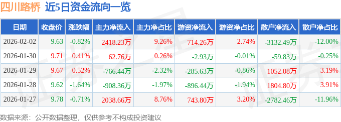 证券之星消息,截至2026年2月2日收盘,四川路桥(600039)报收于9.63元,下跌0.82%,换手率0.31%,成交量26.76万手,成交额2.61亿元。