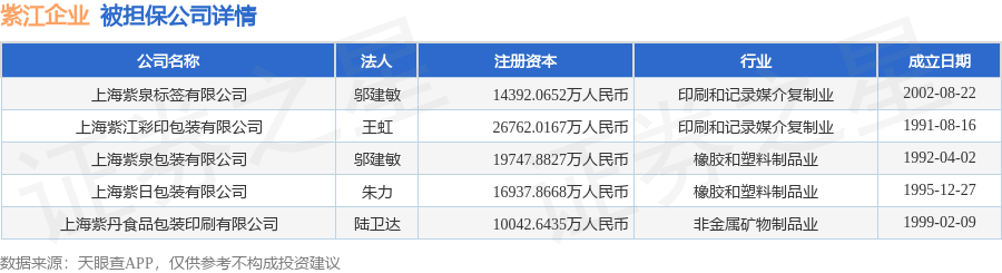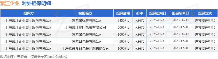 紫江企业1月30日披露5笔对外担保,被担保公司5家。对外担保明细如下表: