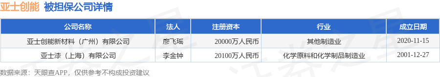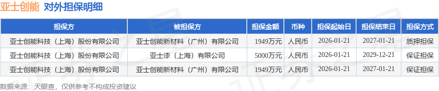 亚士创能1月30日披露3笔对外担保,被担保公司2家。对外担保明细如下表:
