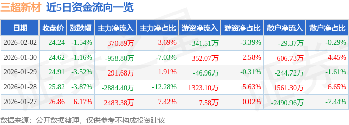 证券之星消息,截至2026年2月2日收盘,三超新材(300554)报收于24.24元,下跌1.54%,换手率5.17%,成交量4.09万手,成交额1.01亿元。