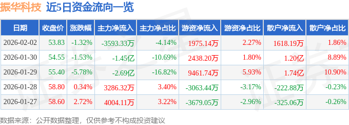 证券之星消息,截至2026年2月2日收盘,振华科技(000733)报收于53.83元,下跌1.32%,换手率2.86%,成交量15.83万手,成交额8.69亿元。