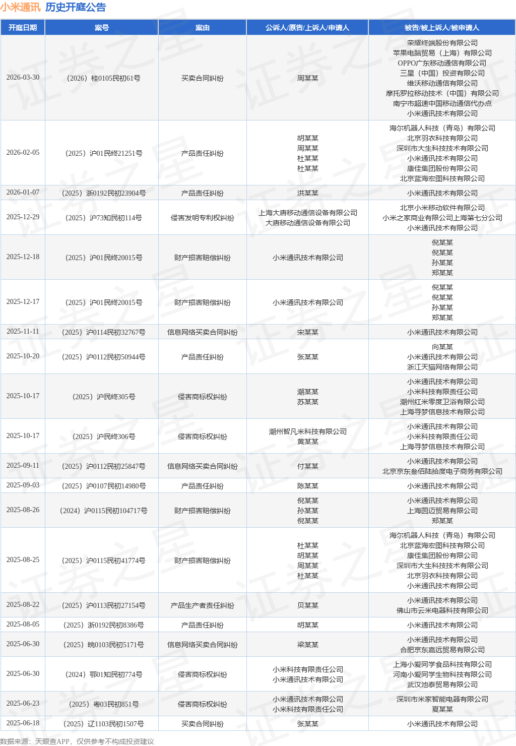 案号:(2025)沪01民终21251号根据统计,近一年内以小米通讯技术有限公司为当事人的历史开庭公告有57则,其中案由为“侵害商标权纠纷”的公告以11则居首,其次为“产品责任纠纷”有9则,“财产损害赔偿纠纷”有9则。历史开庭公告(前20条)如下: